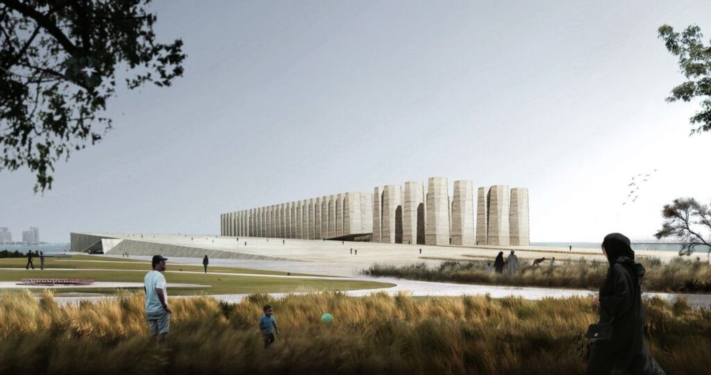 Su propuesta fue seleccionada entre 400 proyectos para ubicarlo en el paseo marítimo de Doha, como si fueran antiguos silos de harina de la principal panificadora del país, integrando la estructura industrial como parte esencial del diseño.