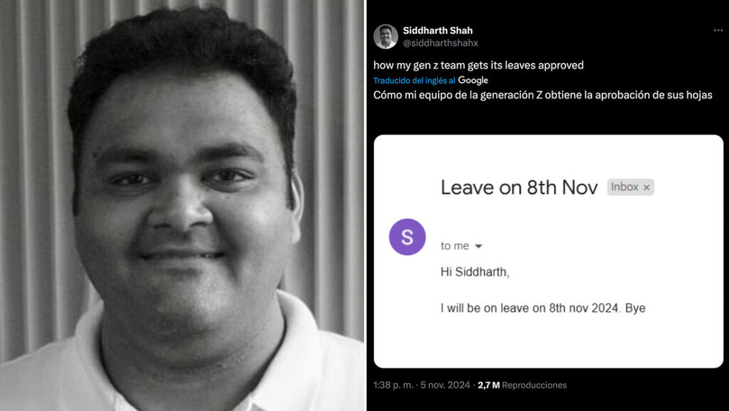 La imagen fue difundida en X por el inversor Siddharth Shah junto a la siguiente nota: «Cómo mi equipo de la generación Z consigue que le apruebe las licencias». En el correo, utilizando un lenguaje informal y directo, el empleado había escrito: «Hola Siddharth, estaré de licencia el 8 de noviembre. Adiós».