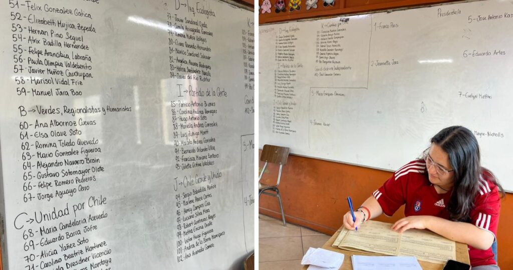 Se trata de la integrante de la mesa 143 del mencionado establecimiento educacional, Catalina Venegas, quien tal como captó La Radio, se dio el tiempo de escribir el nombre de todos los candidatos a diputados y presidentes de la elección en la pizarra de la sala de clases.