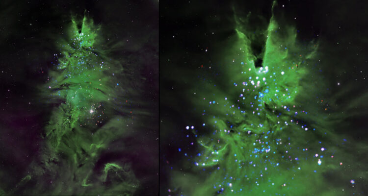 “Los datos ópticos se representan mediante tenues líneas y formas verdes, que crean las ramas y las agujas de la forma del árbol. Los rayos X detectados por Chandra se presentan como luces azules y blancas, y se asemejan a puntos brillantes de luz en el árbol. Los datos infrarrojos muestran las estrellas del primer plano y del fondo como motas blancas brillantes contra la negrura del espacio. La imagen se ha girado unos 150 grados con respecto al punto de referencia del astrónomo, que apunta hacia arriba”, aclara la agencia espacial.
