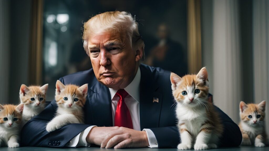Otro internautas crearon imágenes por IA en las que el expresidente salva a las mascotas en diversas situaciones: perseguido por migrantes haitianos, encabezando un ejército de gatitos armados y hasta arrebatándole animales a una Kamala Harris que los amenaza con un cuchillo.