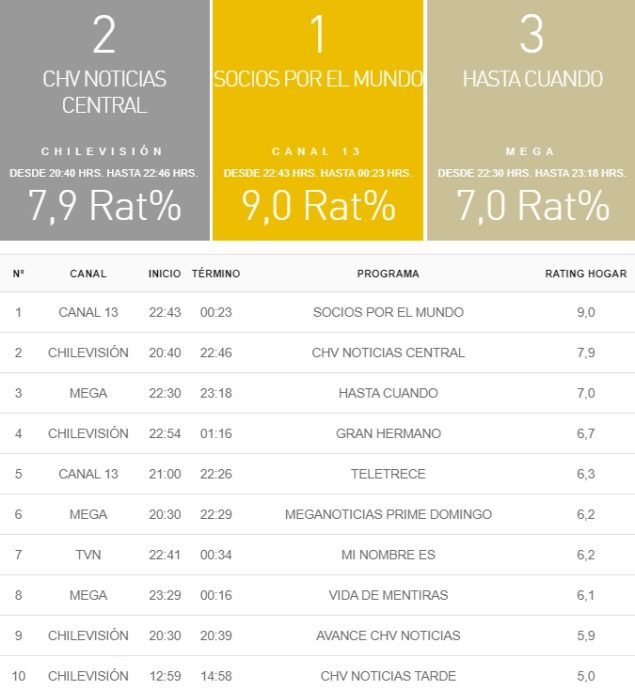 Rating TV Chilena: Domingo 13 de Octubre Deja un comentario / ViralTV Conoce el listado de los diez programas más vistos de la jornada de ayer. Referncia de contenido aquí Más: "Gente llorando": Julio César Rodríguez deja Chilevisión y genera fuerte tensión interna