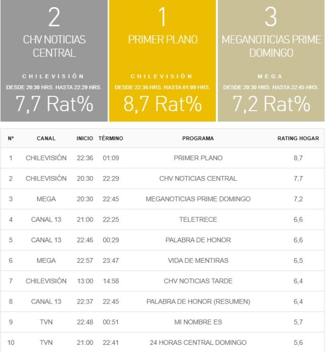 Rating TV Chilena: Domingo 9 de febrero Deja un comentario / ViralRank Conoce el listado de los diez programas más vistos de la jornada de ayer. Referncia de contenido aquí