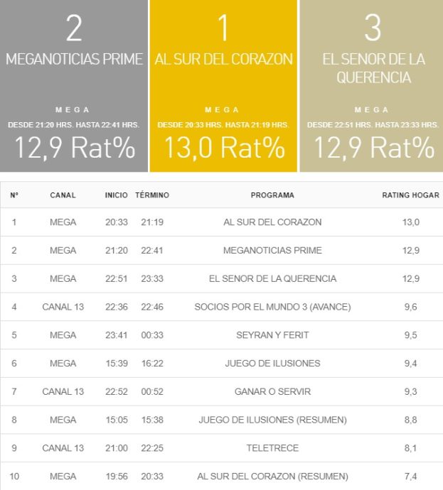 Rating TV Chilena: Jueves 26 de septiembre Deja un comentario / ViralTV Conoce el listado de los diez programas más vistos de la jornada de ayer. Referncia de contenido aquí Más: Javiera Contador reaparece tras su operación de cáncer: "Ya no hay tumor"