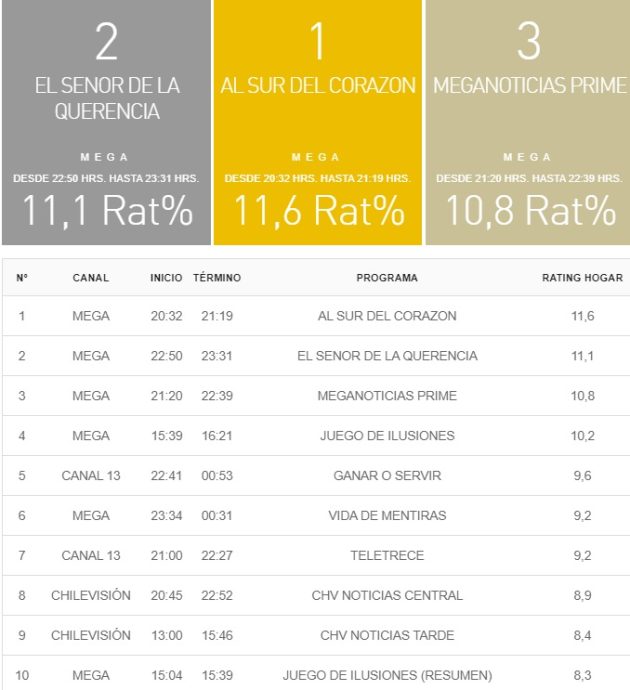 Rating TV Chilena: Martes 08 de octubre Deja un comentario / ViralTV Conoce el listado de los diez programas más vistos de la jornada de ayer. Referncia de contenido aquí Más: Esposo de Javiera Contador entrega detalles sobre su recuperación tras cirugía por cáncer