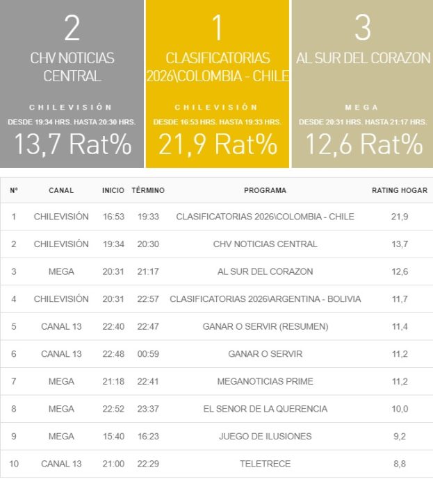 Rating TV Chilena: Martes 15 de octubre Deja un comentario / ViralTV Conoce el listado de los diez programas más vistos de la jornada de ayer. Referncia de contenido aquí Más: Javiera Contador reaparece tras su operación de cáncer: "Ya no hay tumor"