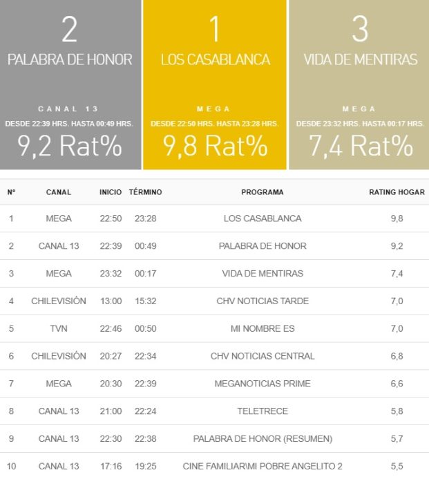 Conoce el listado de los diez programas más vistos de la jornada de ayer.