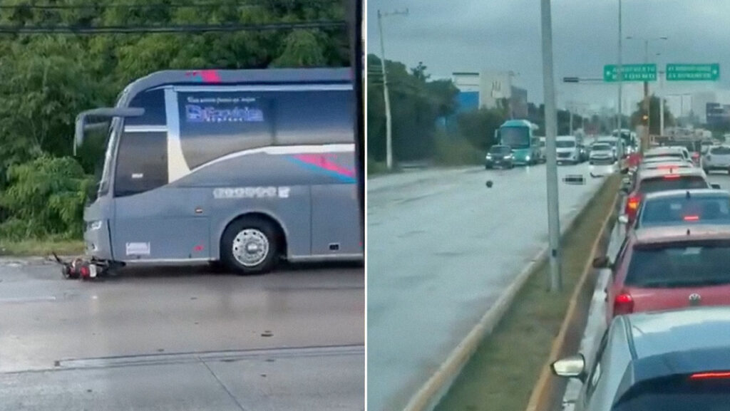 Un autobús de pasajeros impactó a una motocicleta en la que viajaban dos personas en una autopista en Cancún, México. Tras el choque, ambos ocupantes de la moto salieron proyectados contra el pavimento. Un video compartido en las redes muestra a la motocicleta siendo arrastrada varios metros antes de que el autocar se detuviera. El estado de los heridos se reporta como reservado, mientras que el conductor del autobús se dio a la fuga a pie.