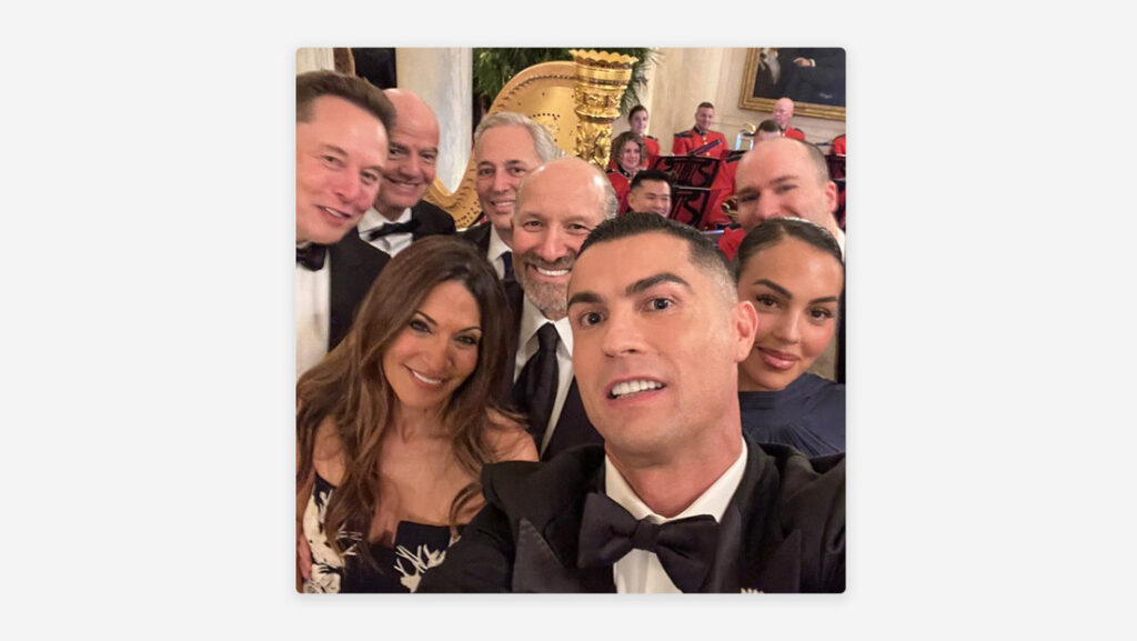 Pero el selfi viral captó juntos al astro portugués y su pareja, Georgina Rodríguez; al magnate tecnológico Elon Musk; al presidente de la FIFA, Gianni Infantino; al secretario de Comercio de Estados Unidos, Howard Lutnick, y a su pareja, Allison; así como al propio David Sacks y al presidente de OpenAI, Greg Brockman.