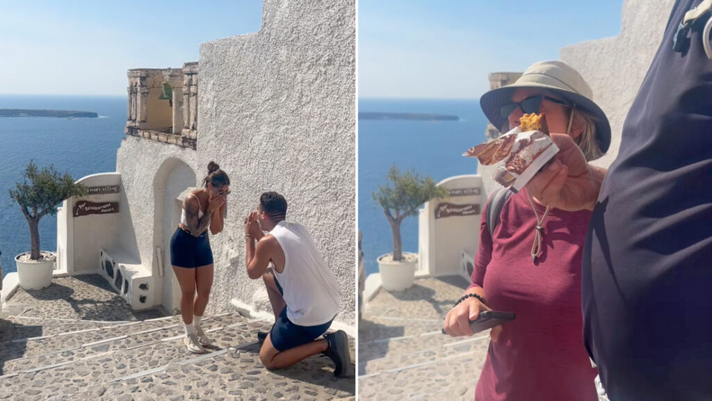 En las redes sociales se viralizó el video de una pareja joven que quería grabar su compromiso en la isla griega de Santorini. Sin embargo, en el momento conmovedor dos turistas aparecieron en primer plano, uno de ellos con una chocolatina en las manos, tapando a los novios y comiendo el dulce. La publicación ha obtenido más de 40 millones de vistas en la Red.