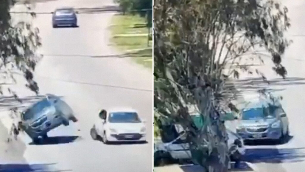 Un hombre en Ensenada (Argentina) conducía mientras miraba el celular, provocando un accidente donde impactó a otro automóvil. Tras el choque, el vehículo que conducía se desestabilizó, dirigiéndose hacia dos peatones. Las imágenes captadas en video por cámaras de seguridad muestran cómo solo gracias un rápido movimiento del volante el conductor evita una tragedia.