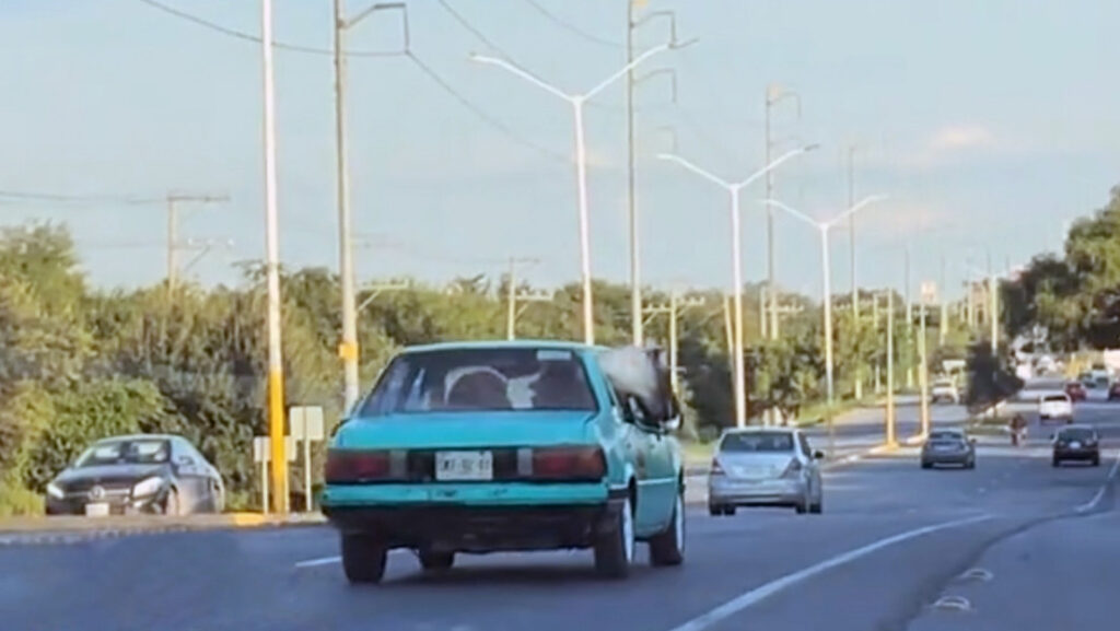 Un insólito momento se vivió en una carretera del municipio de Cadereyta Jiménez, en el estado mexicano de Nuevo León, cuando fue captado un poni viajando dentro de un pequeño automóvil clásico.