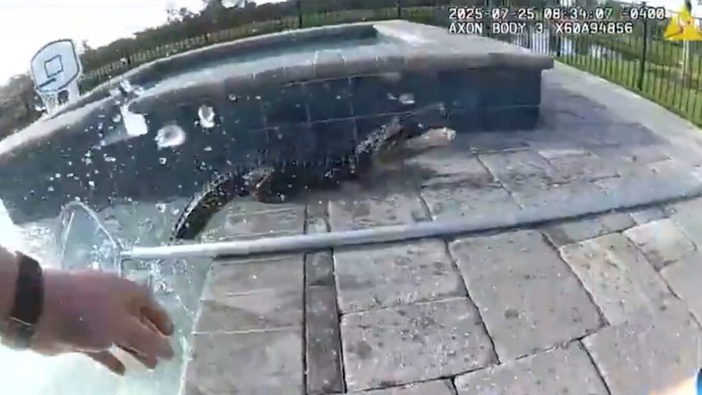 Un policía atrapó con sus manos, sin ninguna protección adicional, a un caimán que se encontraba en la piscina de un residente de Florida (EE.UU.). En el video, grabado con su cámara corporal, se observa cómo el agente primero arrastra al animal hasta el borde hasta que logra sacarlo del agua, posteriormente lo levanta del cuello y lo lleva hasta su patrulla. Una vez allí, lo colocó en la parte trasera del vehículo y le abrochó el cinturón de seguridad.